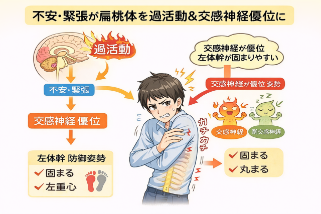 不安や緊張、強いプレッシャーを感じると、脳の「扁桃体」という部分が過活動になります 。扁桃体が興奮すると自律神経の「交感神経」が優位になり、身体は瞬時に「逃げるか戦うか」のモードに切り替わります 。 この時、人間は無意識に身体を丸め、身を守るための「防御姿勢」をとりますが、この姿勢は特に左側の体幹を固めやすい性質があります 。精神的な緊張が、物理的な左体幹の固着として現れるのです。