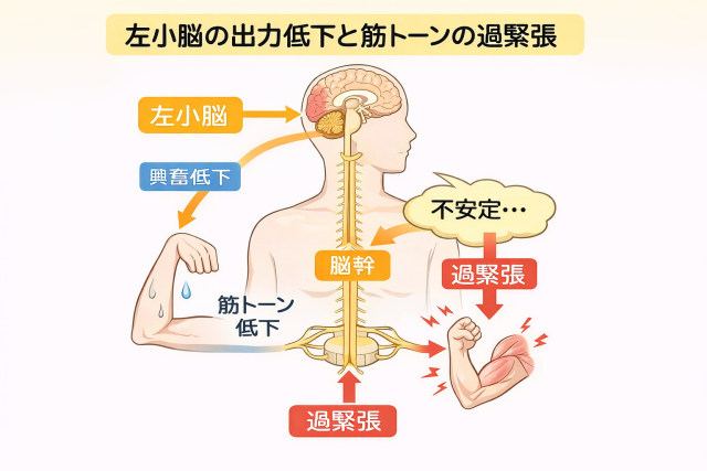 小脳は、全身の筋肉の張り(トーン)を微調整するセンターです 。 左側の小脳の出力が低下すると、本来なら筋肉のトーンは下がります 。しかし、脳幹という別の部位が「支えがなくなって不安定だ!」と感知し、無理やり過剰な緊張を上乗せしてしまいます 。この「不安定を埋めるための過緊張」は、小脳の機能を活性化させない限り解消されません