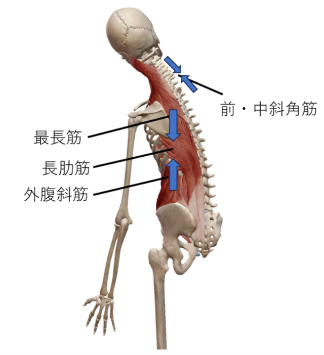 1.重心の崩れ: 左側の体幹筋肉(腸肋筋、最長筋、外腹斜筋)が短縮・緊張すると、身体の重心が左側に引っ張られ、傾きます 。