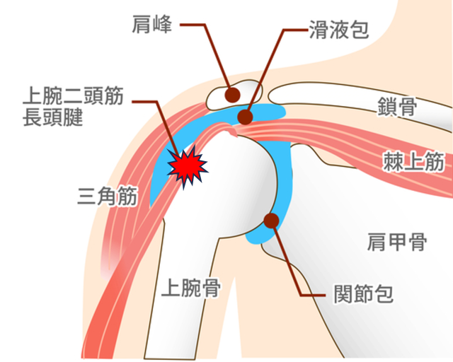肩関節前方を走る上腕二頭筋長頭腱に炎症が起こります。