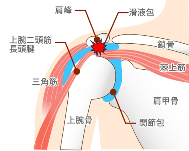 上腕骨頭が本来より上方へ移動し、腱板や滑液包が肩峰の下で挟み込まれる状態です。