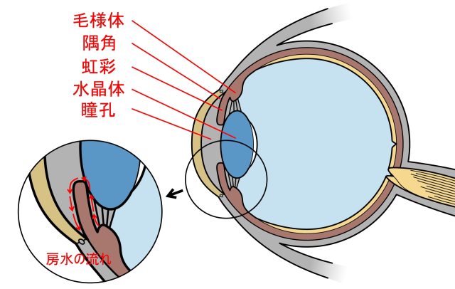 毛様体(もうようたい)で作られた房水は眼球内を循環して栄養を供給、老廃物を除去し、隅角で排水されていくため、房水の排水口の役割を果たしている隅角が狭くなることで房水の流れが妨げられ、眼圧が上がってしまうのです。