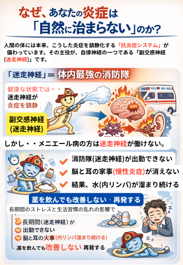 健康な状態であれば、迷走神経がしっかり働き、抗炎症作用を発揮して、脳や耳の炎症を速やかに鎮火してくれます。 しかし、メニエール病でお悩みの方の多くは、長期間のストレスや生活習慣の乱れにより、この迷走神経のパワーが著しく低下しています。