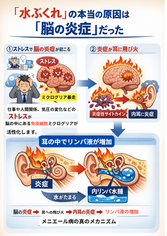 この脳内で起きた炎症(サイトカインの放出)は、脳と繋がっている内耳にも波及します。 「脳の炎症 → 耳への飛び火 → 内耳の炎症 → 防御反応として水(リンパ)が溜まる」 これが、メニエール病特有の「内リンパ水腫」が形成される真のメカニズムです。
