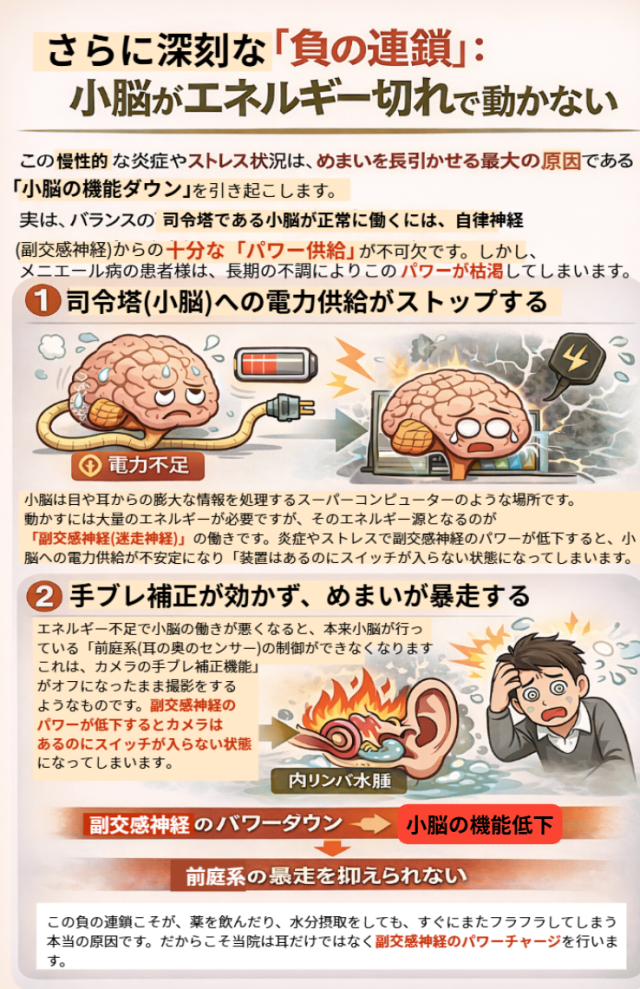 この慢性的な炎症やストレス状況は、めまいを長引かせる最大の原因である**「小脳の機能ダウン」**を引き起こします。